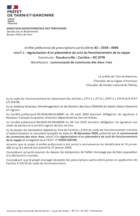 Arrêté Préfectoral – Régularisation d’un piézomètre de suivi du fonctionnement de la nappe