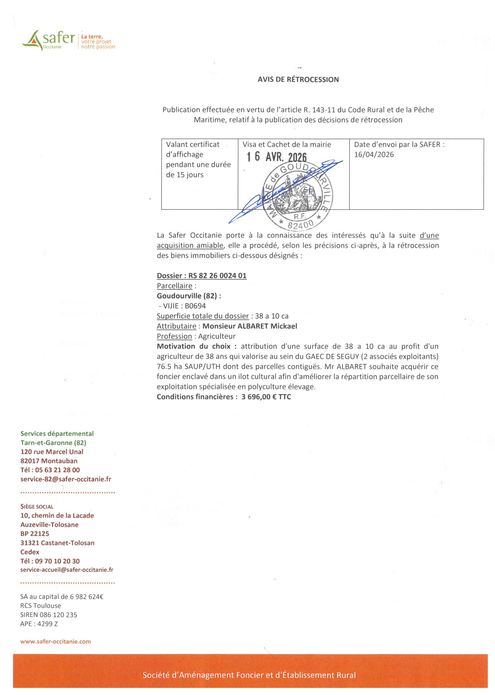 Publication avis de rétrocession SAFER