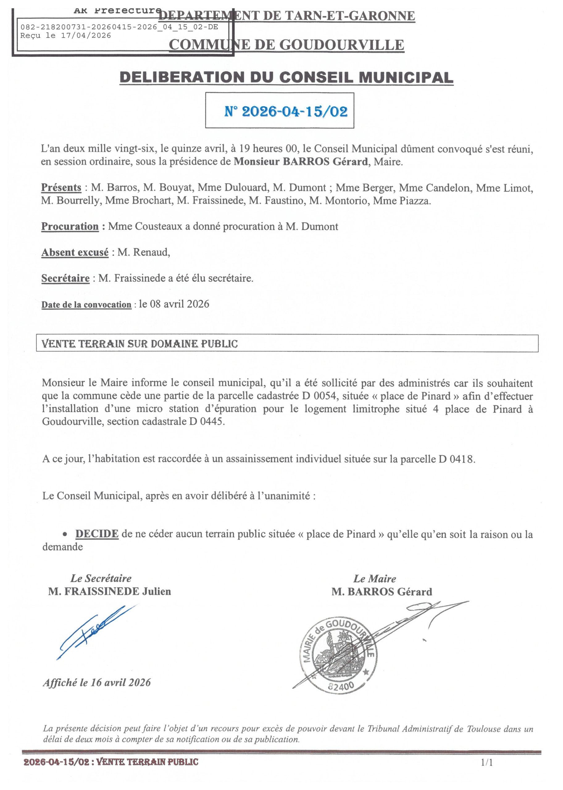 Délibération vente terrain sur domaine public – Place de Pinard